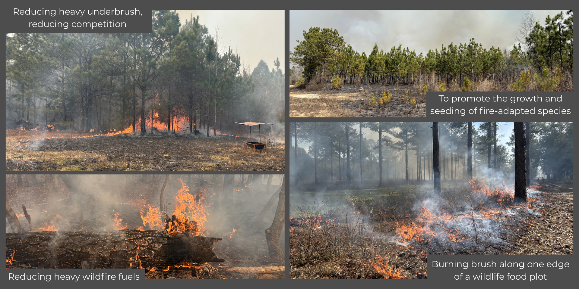 As spring approaches in the Southeast, our burn focus begins to shift away from mostly fuel reduction and wildfire prevention to many overlapping burn objectives. As our dormant season is slowly overtaken by the growing season, not only must we consider a greater percentage of water-heavy vegetation and higher temperatures, but we have wildlife nesting and foraging opportunities to consider. Thinking about only bobwhite quail, March and April is ideal to promote rapid green-up and nesting cover but June through October is ideal for knocking back the woody vegetation that chokes out native vegetation that is the ideal food source for adult quail. If you have multiple ecosystems or wildlife species you are wanting to promote, this decision requires even more consideration.